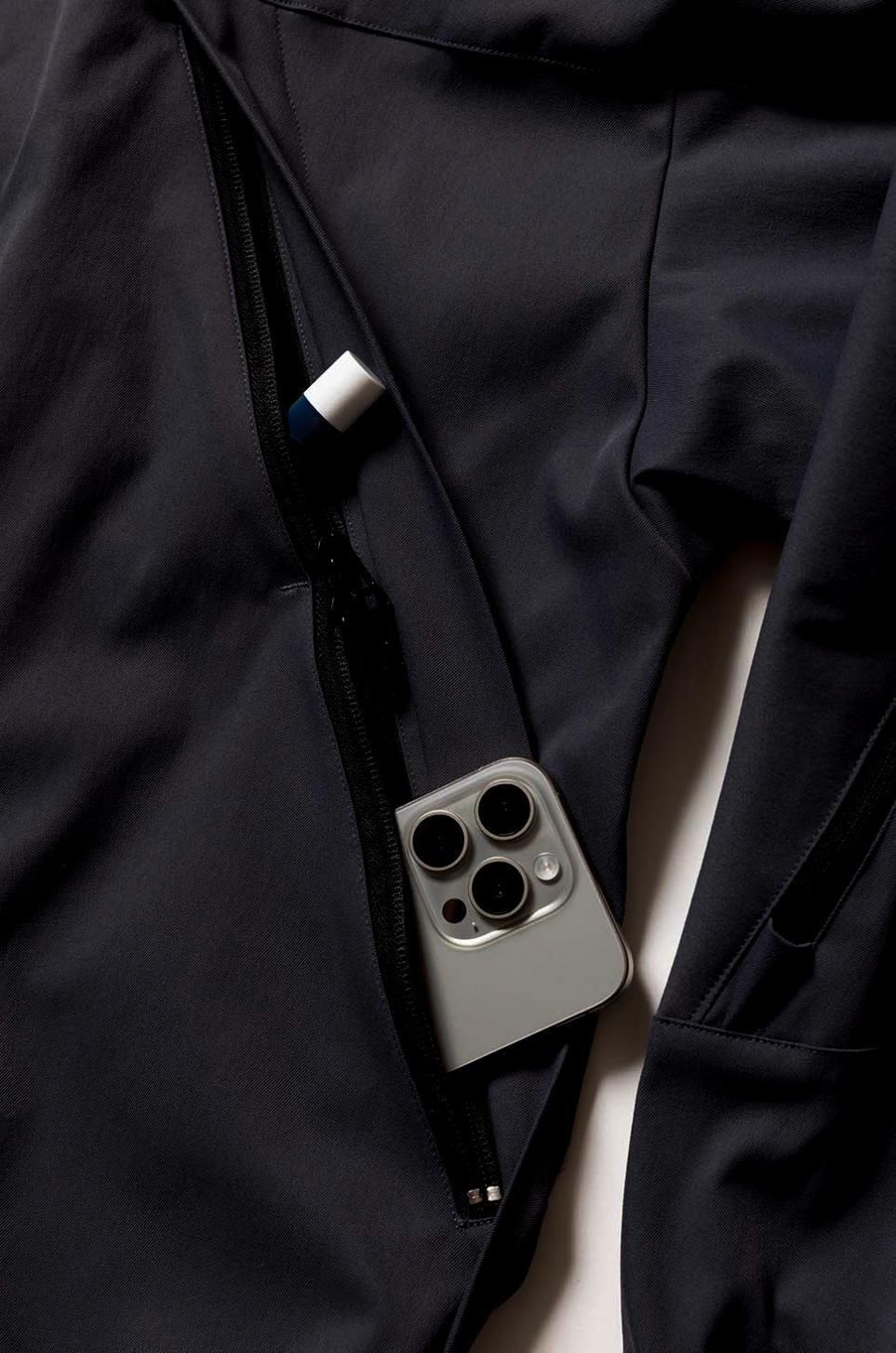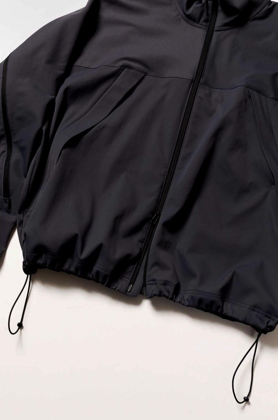 袖口はゴム入り、裾にはドローコード、ハの字ジッパーは上下に仕切られていて利便性に優れた収納システム