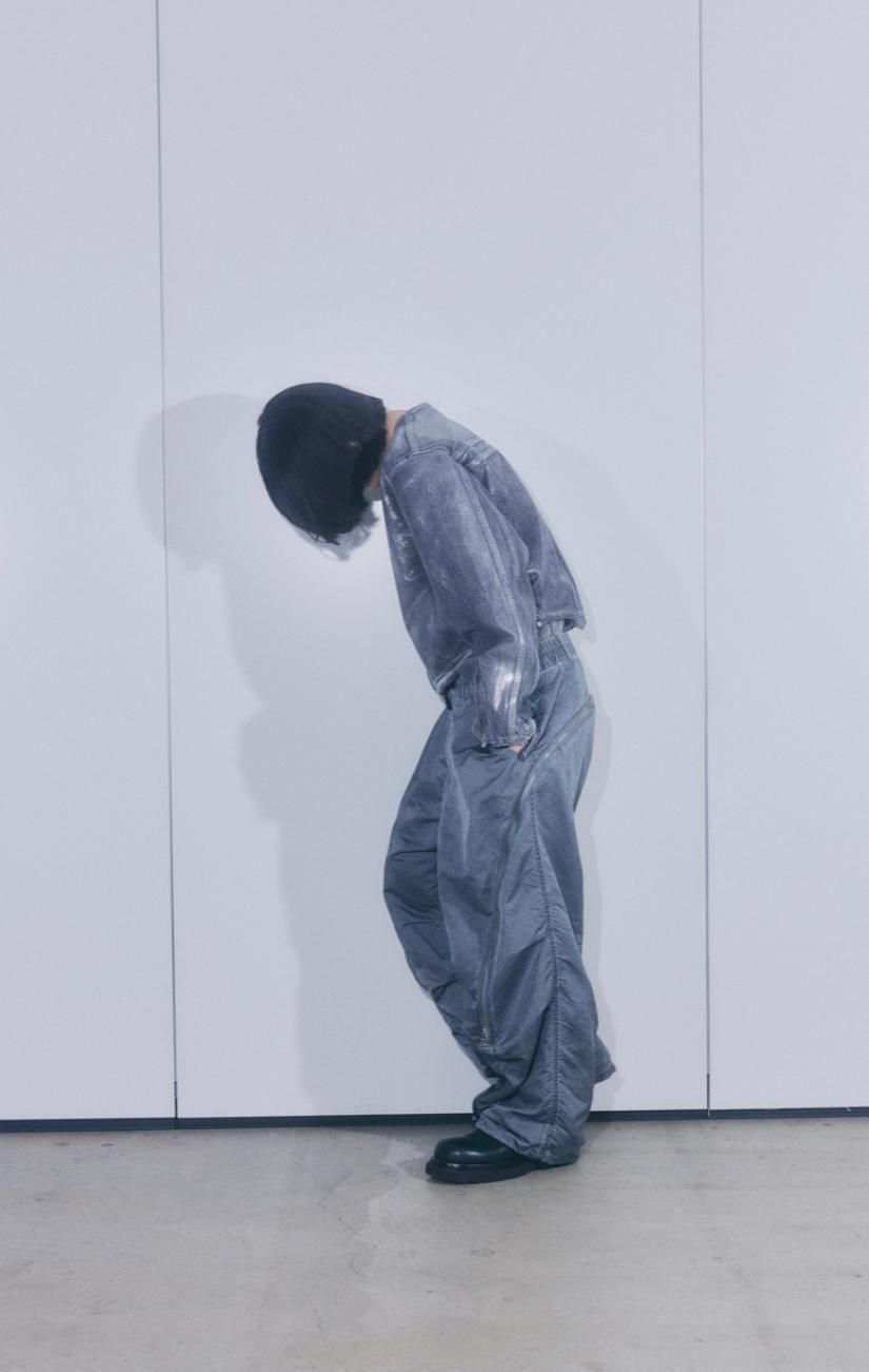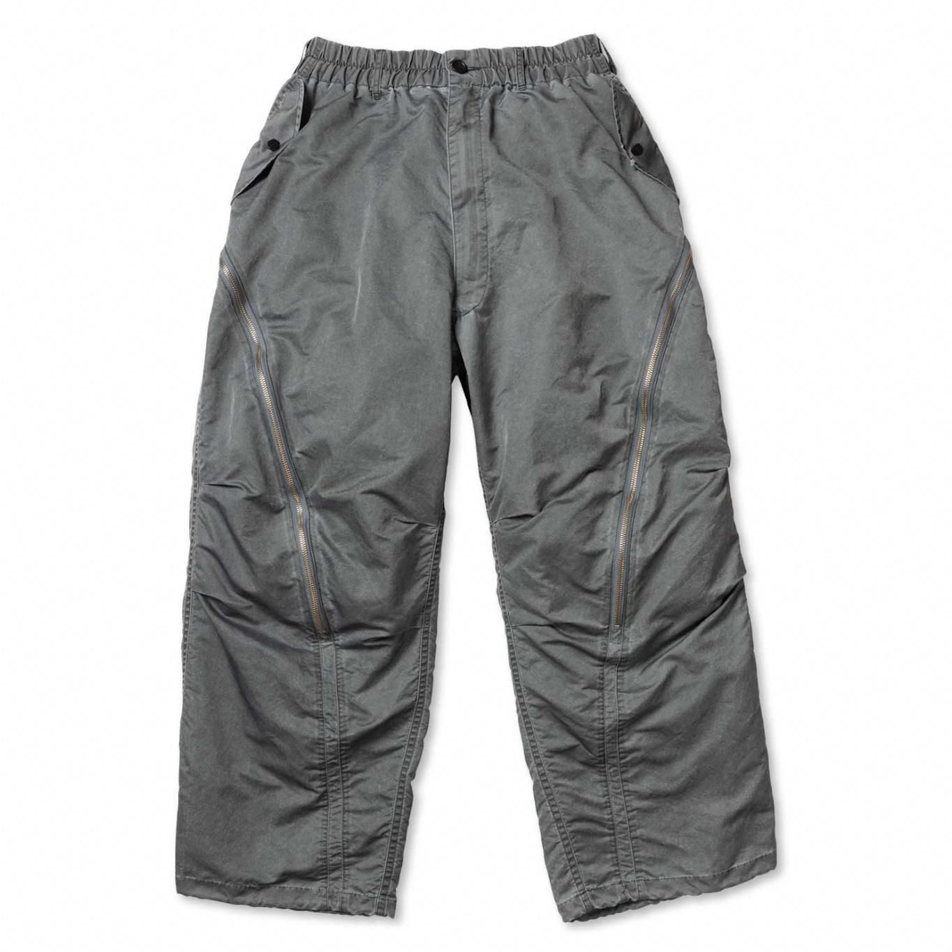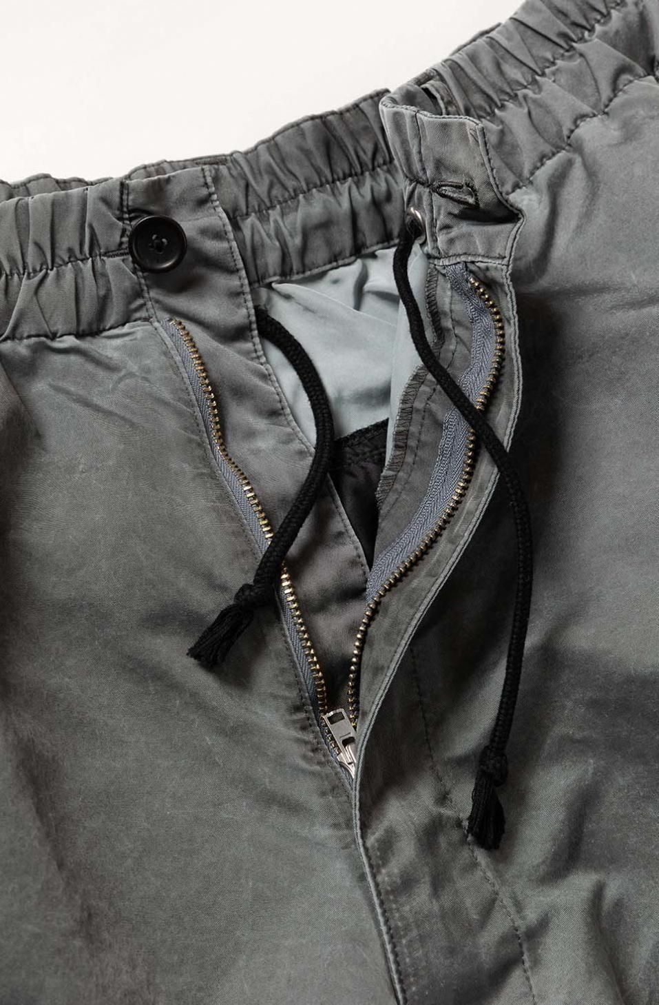 ナイロンオックスに顔料プリントを施し、製品加工によって石のような質感とパッカリングを表現したナイロン素材のトルネードパンツ