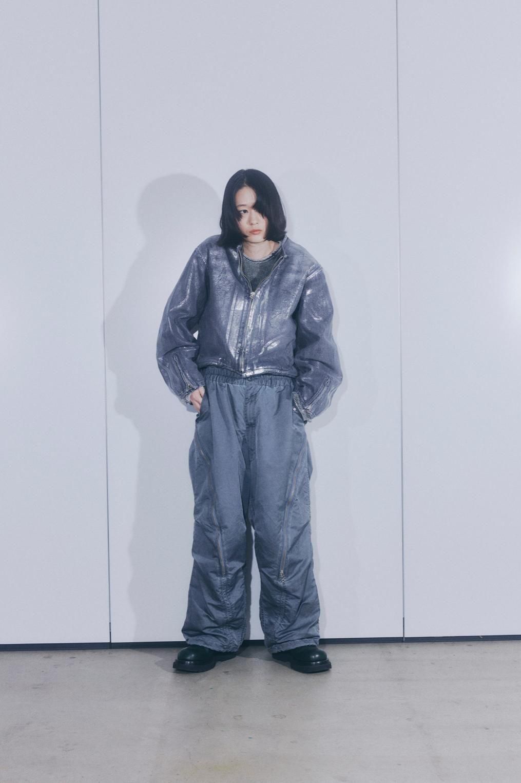 背面からフロント膝下までぐるりと配したジップがデザインアクセントでサイズ調整が可能